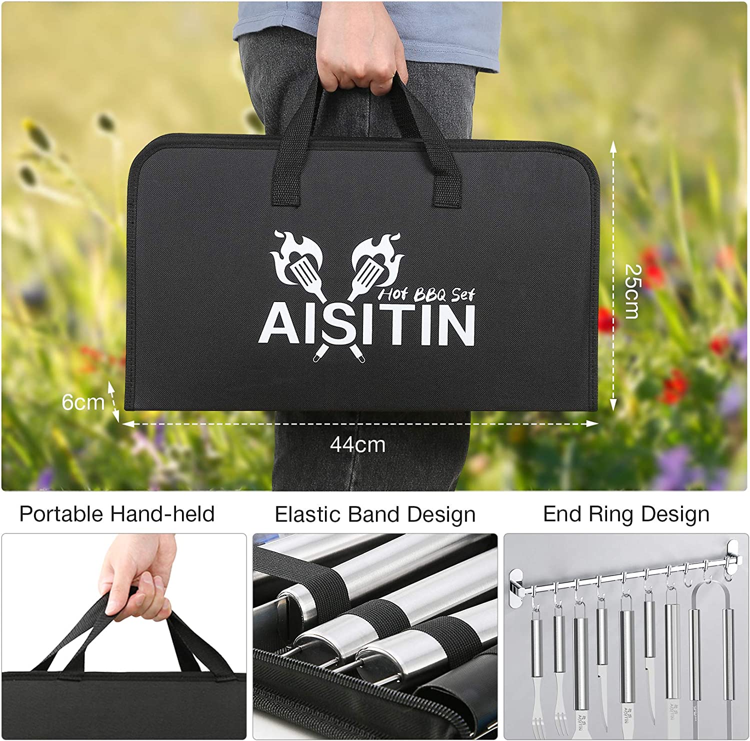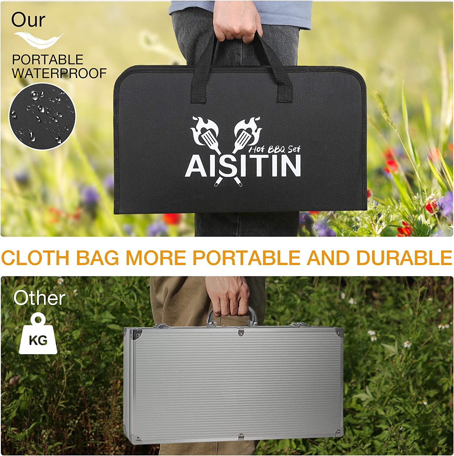 • 【Portátiles Utensilios Barbacoa Set】: Accesorios barbacoa se almacenan en una bolsa de tela portátil duradera que es más liviana que caja empaque aluminio, que es más conveniente de transportar. Viajar, acampar o hacer senderismo puede traer nuestros AISITIN accesorios barbacoa.